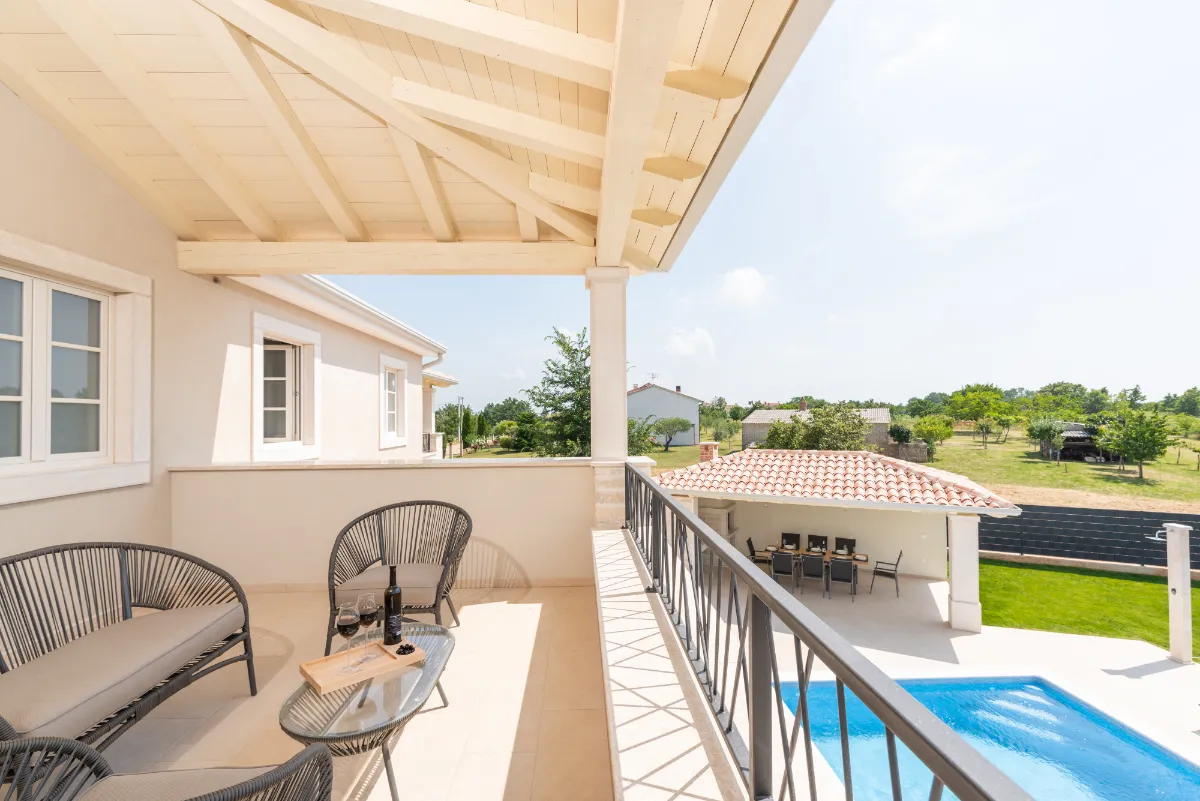 Smještena na kraju istarskog sela Kaštelira, okružena zelenilom i vinogradima, s terase se nazire more... vila spaja najbolje od Istre u jednom pogledu.