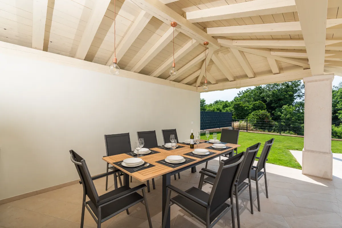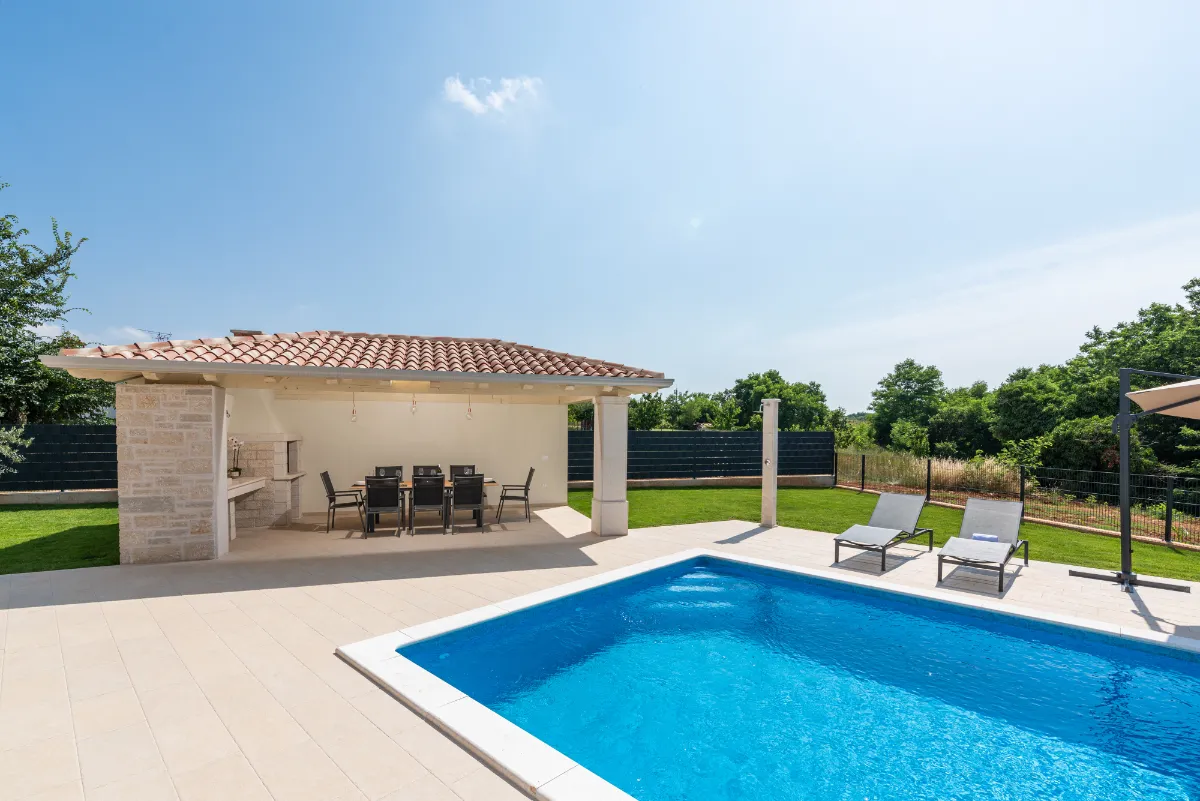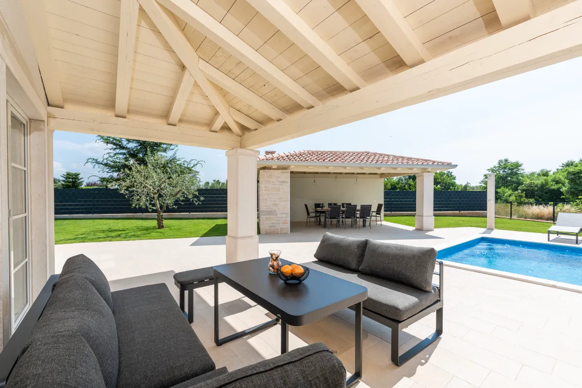 Privatni bazen, terasa s blagovaonicom, roštiljem i lounge dijelom omogućuju boravak na otvorenom u privatnosti, okruženi prirodom i mirom. Veliki ograđeni vrt idealan je za boravak i igru kućnih ljubimaca, uz set igračaka I pseći park u blizini.